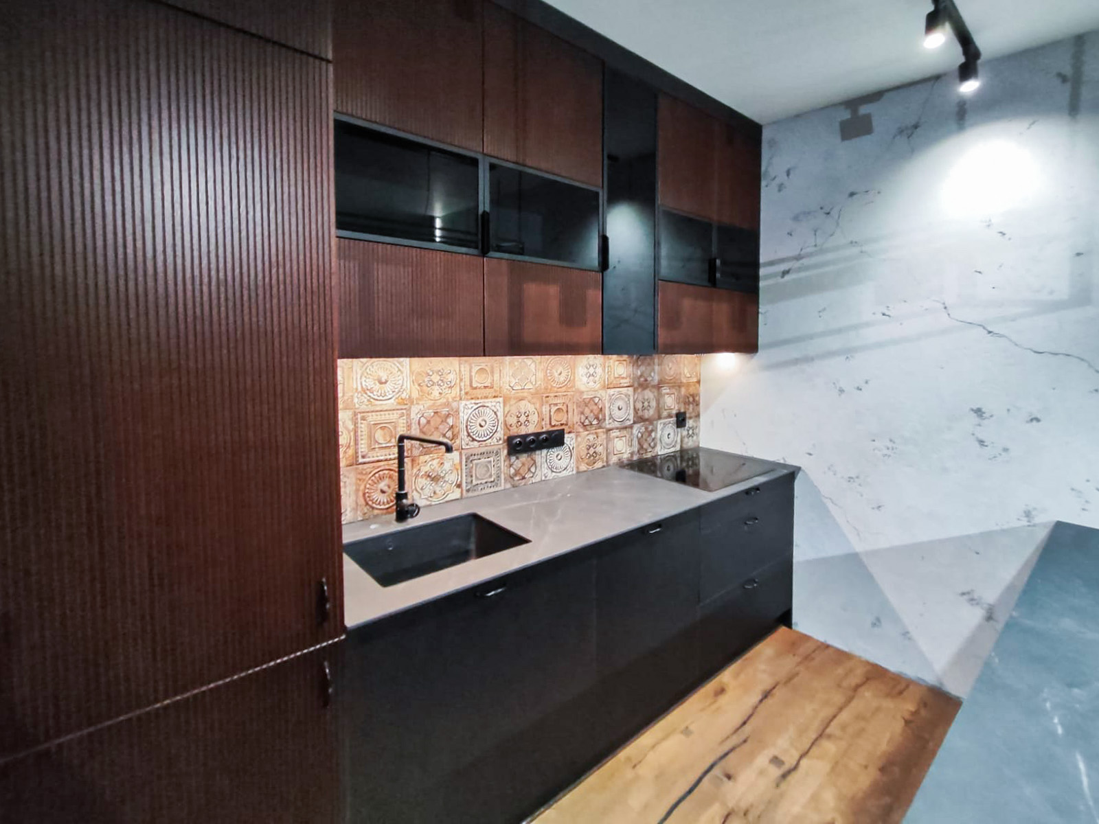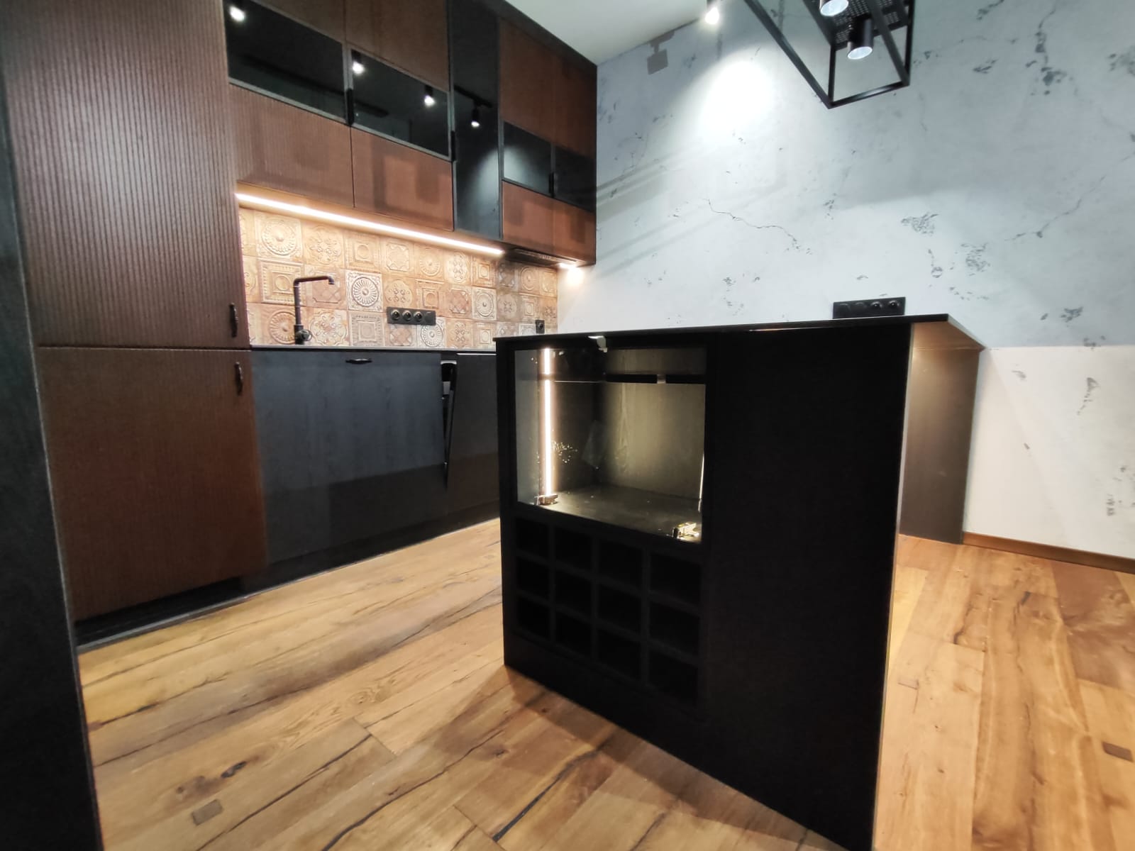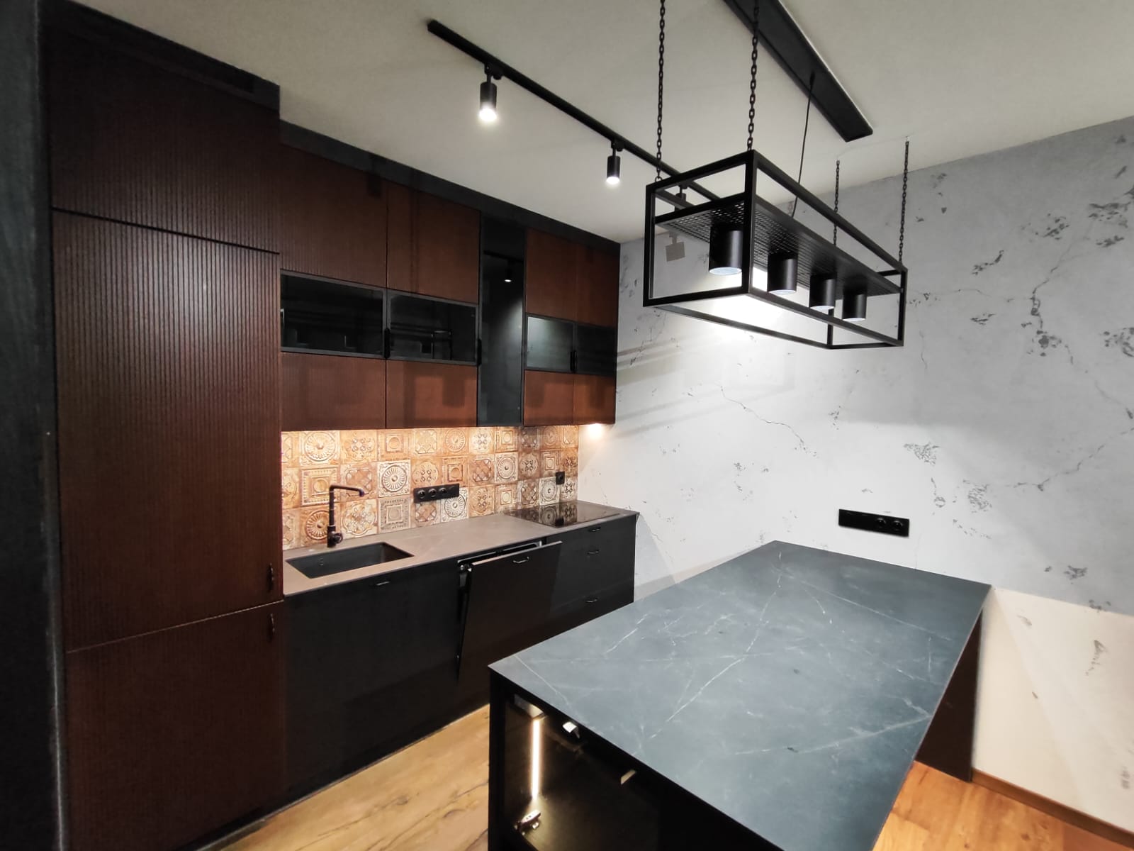 Kuchnia została wykonana z wysokiej jakości frontów o ciemnym, ryflowanym wykończeniu, które nadają meblom elegancki i nowoczesny charakter. Górne szafki z częściowo przeszklonymi frontami oraz podświetlanym wnętrzem dodają lekkości i funkcjonalności przestrzeni. Wyspa oraz blat roboczy z ciemnego kamienia tworzą spójną, solidną konstrukcję, a całość dopełniają starannie dobrane detale jak metalowe uchwyty i designerskie oświetlenie.