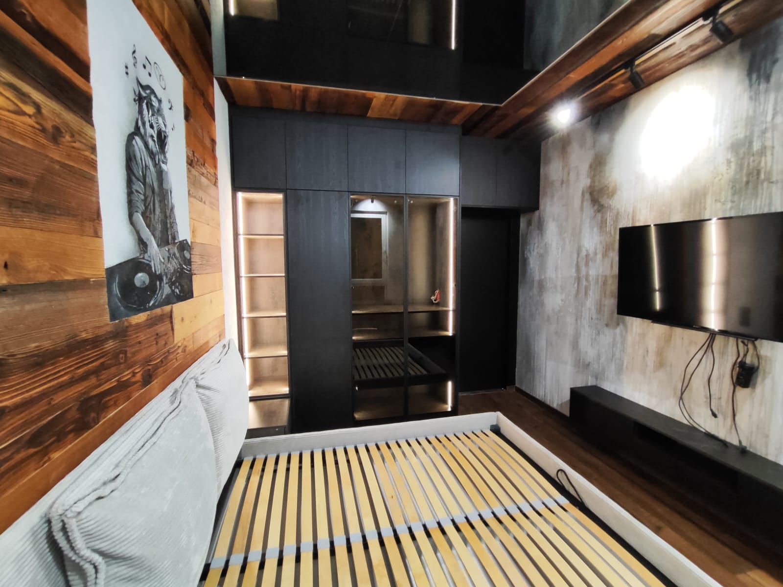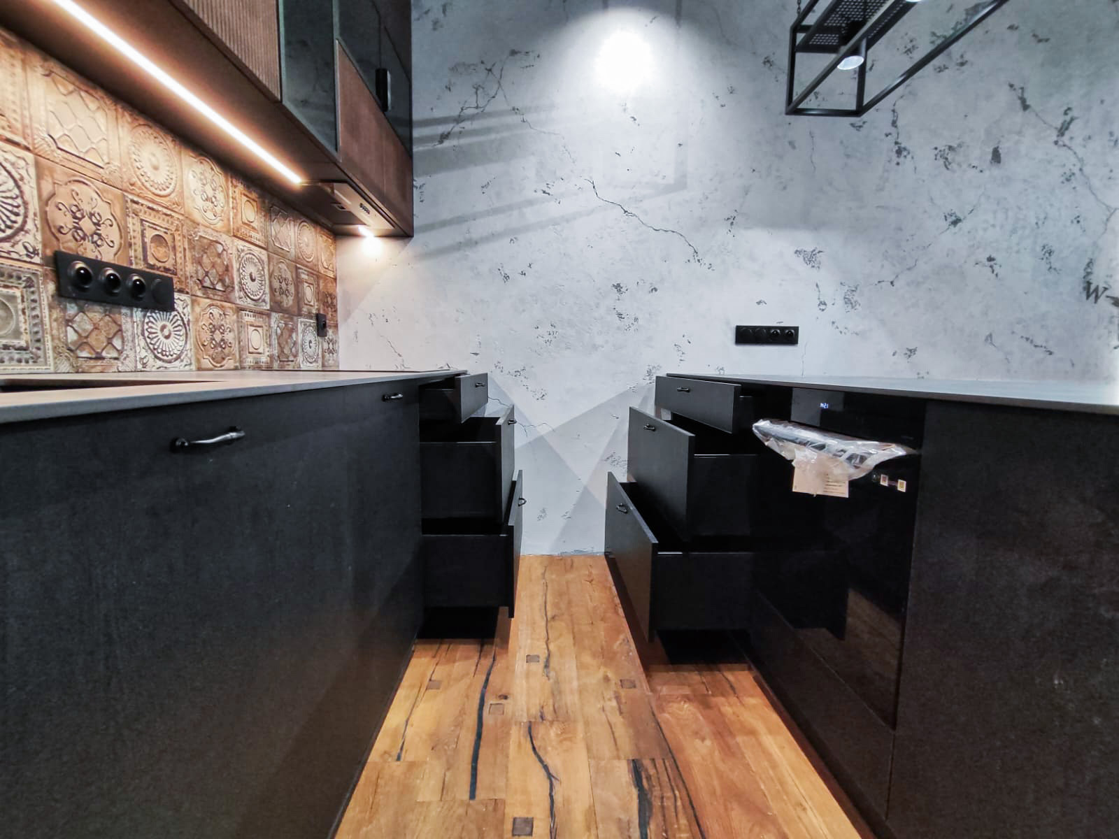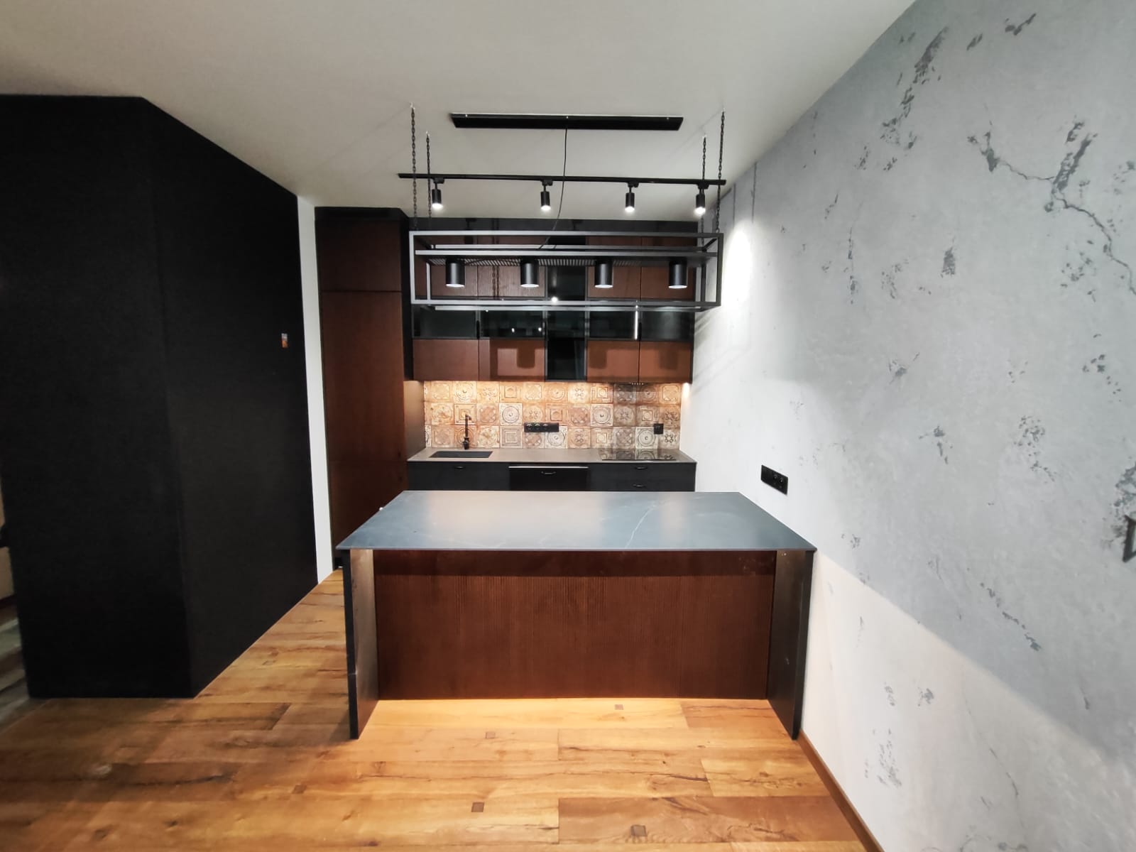 Kuchnia została wykonana z wysokiej jakości frontów o ciemnym, ryflowanym wykończeniu, które nadają meblom elegancki i nowoczesny charakter. Górne szafki z częściowo przeszklonymi frontami oraz podświetlanym wnętrzem dodają lekkości i funkcjonalności przestrzeni. Wyspa oraz blat roboczy z ciemnego kamienia tworzą spójną, solidną konstrukcję, a całość dopełniają starannie dobrane detale jak metalowe uchwyty i designerskie oświetlenie.