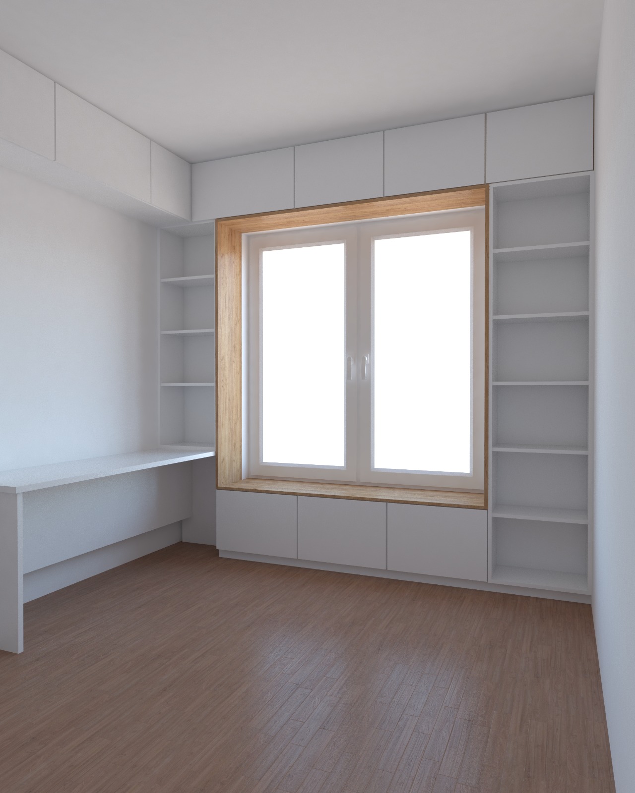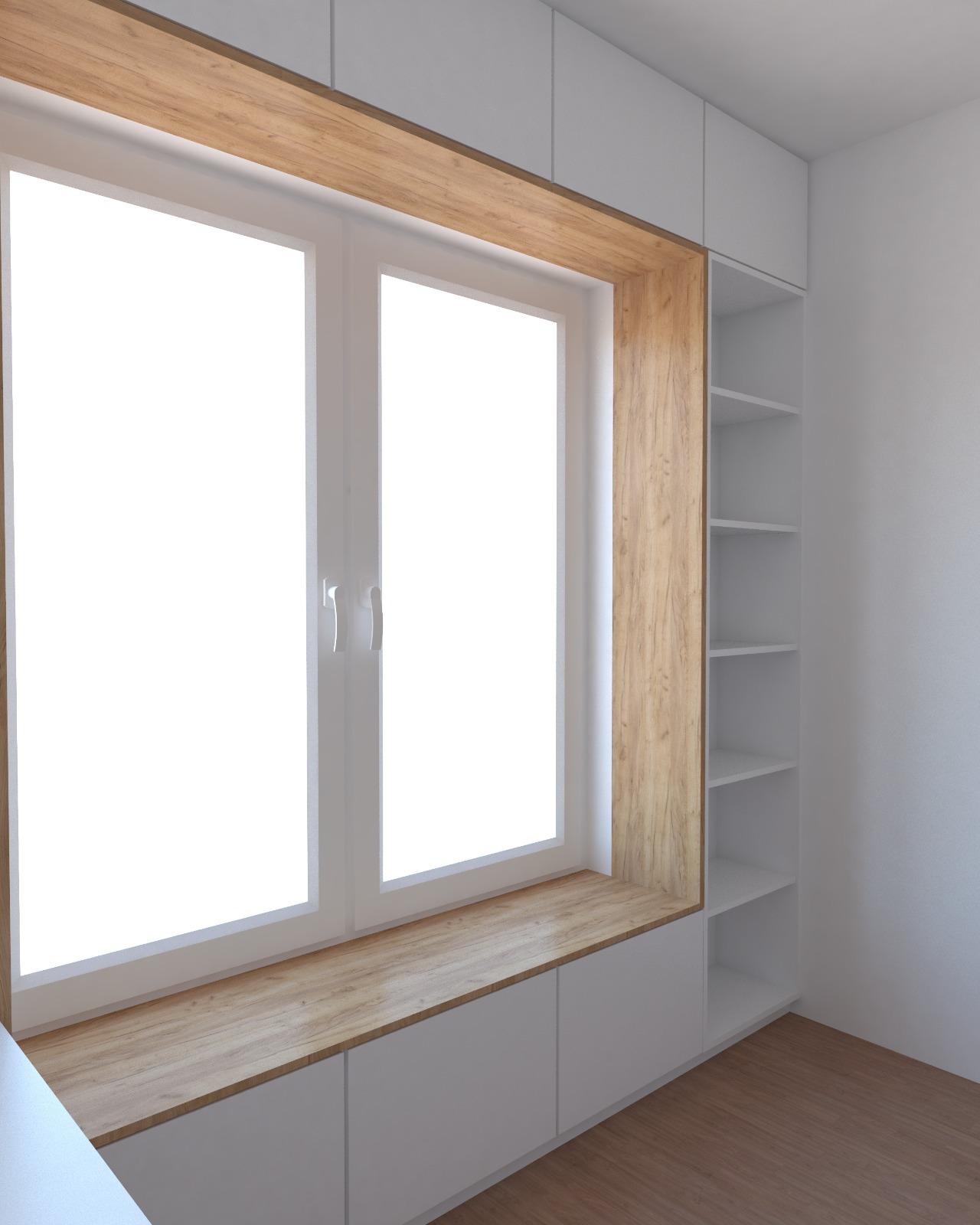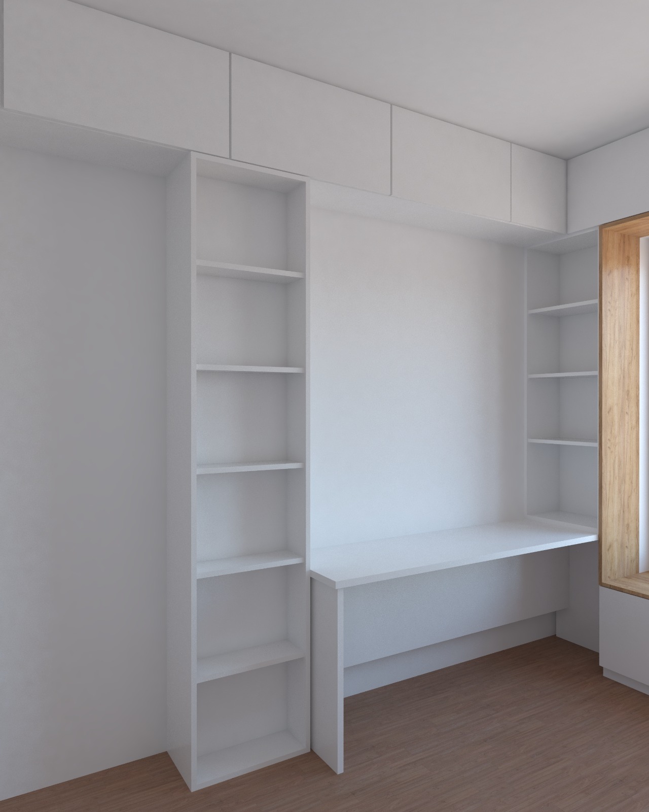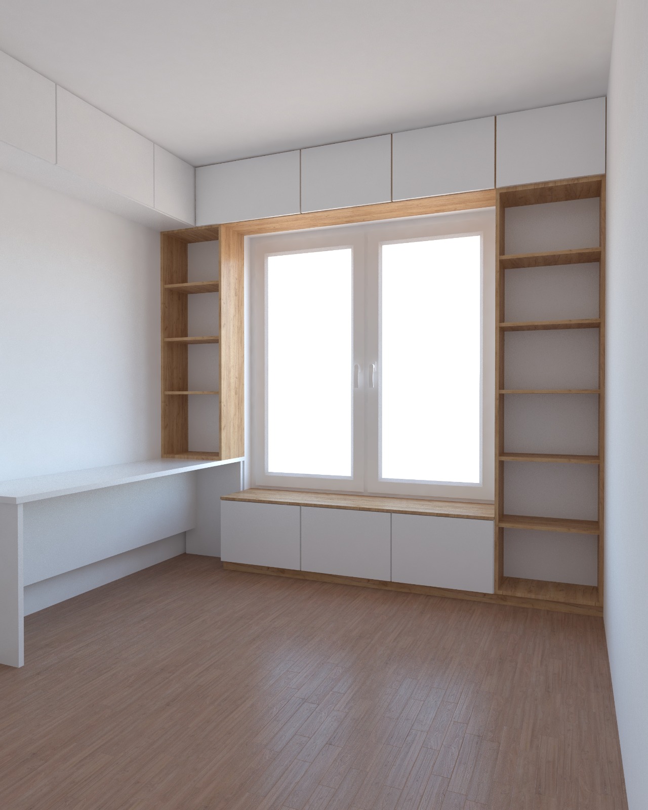 Wnętrze jest urządzone minimalistycznie, z zabudową stolarską projektowaną na wymiar, która maksymalnie wykorzystuje ścianę z oknem. Połączenie białych frontów z drewnianą wnęką tworzy czysty, uporządkowany i ciepły efekt, a regały oraz górne szafki zapewniają dużo miejsca do przechowywania bez obciążania przestrzeni. Długi blat po lewej stronie pełni funkcję wygodnego biurka, pozostawiając wnętrze lekkim i funkcjonalnym.
