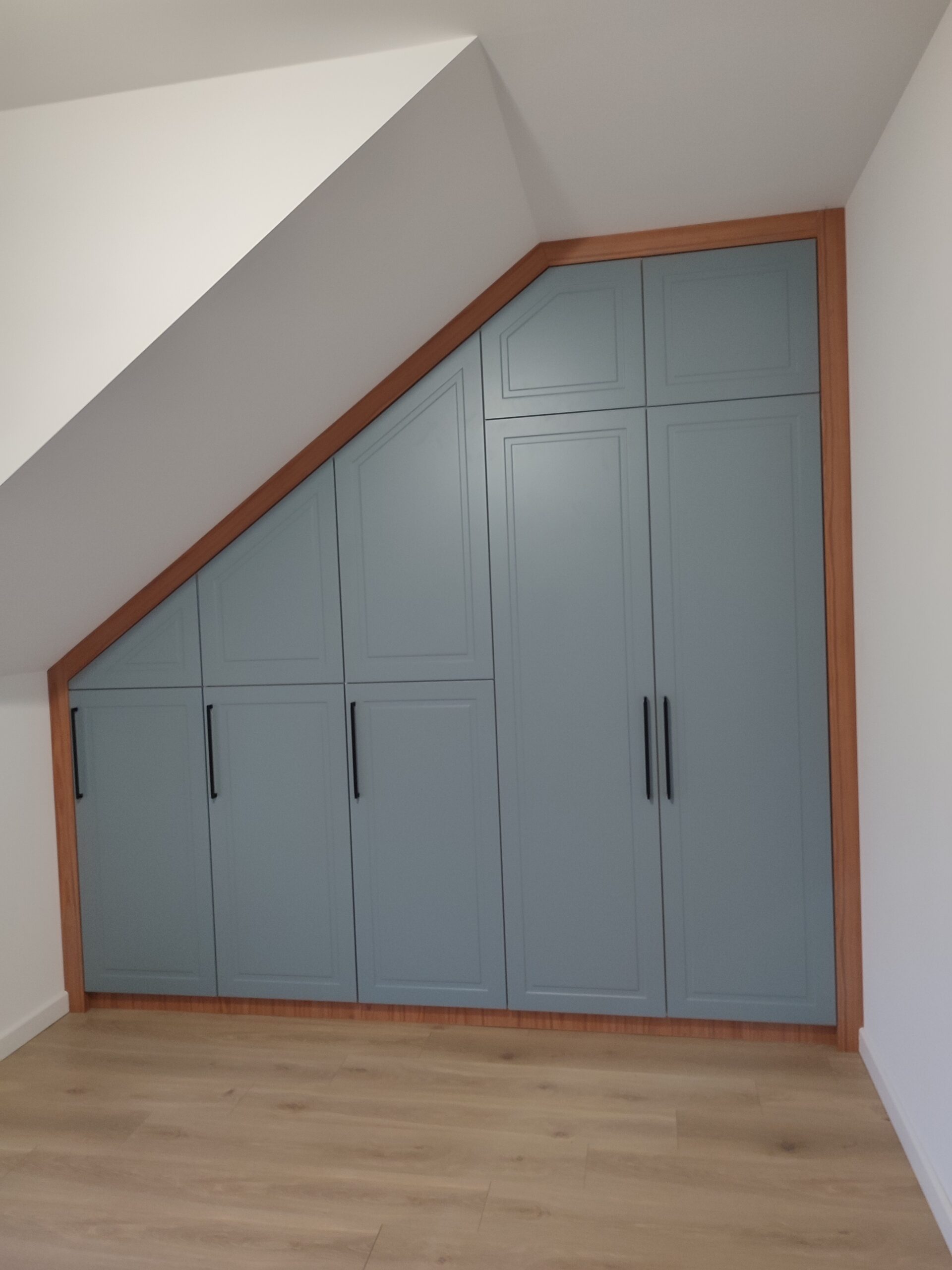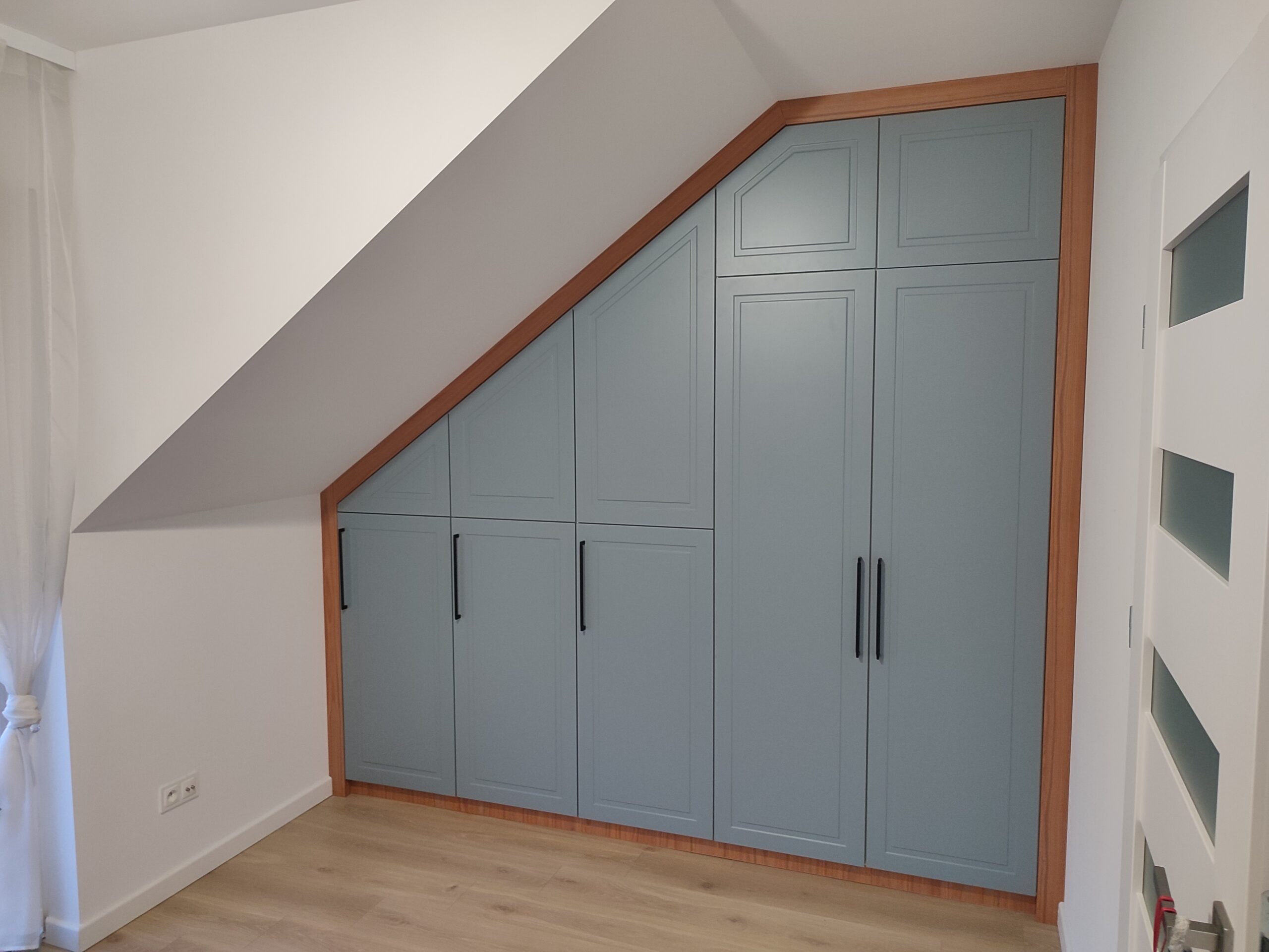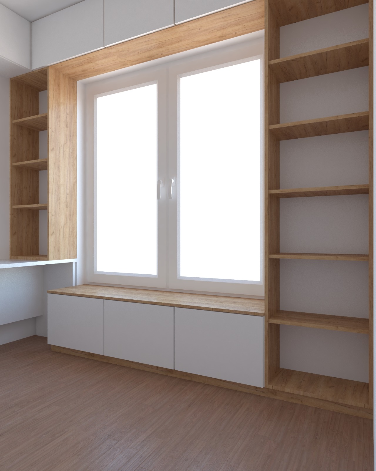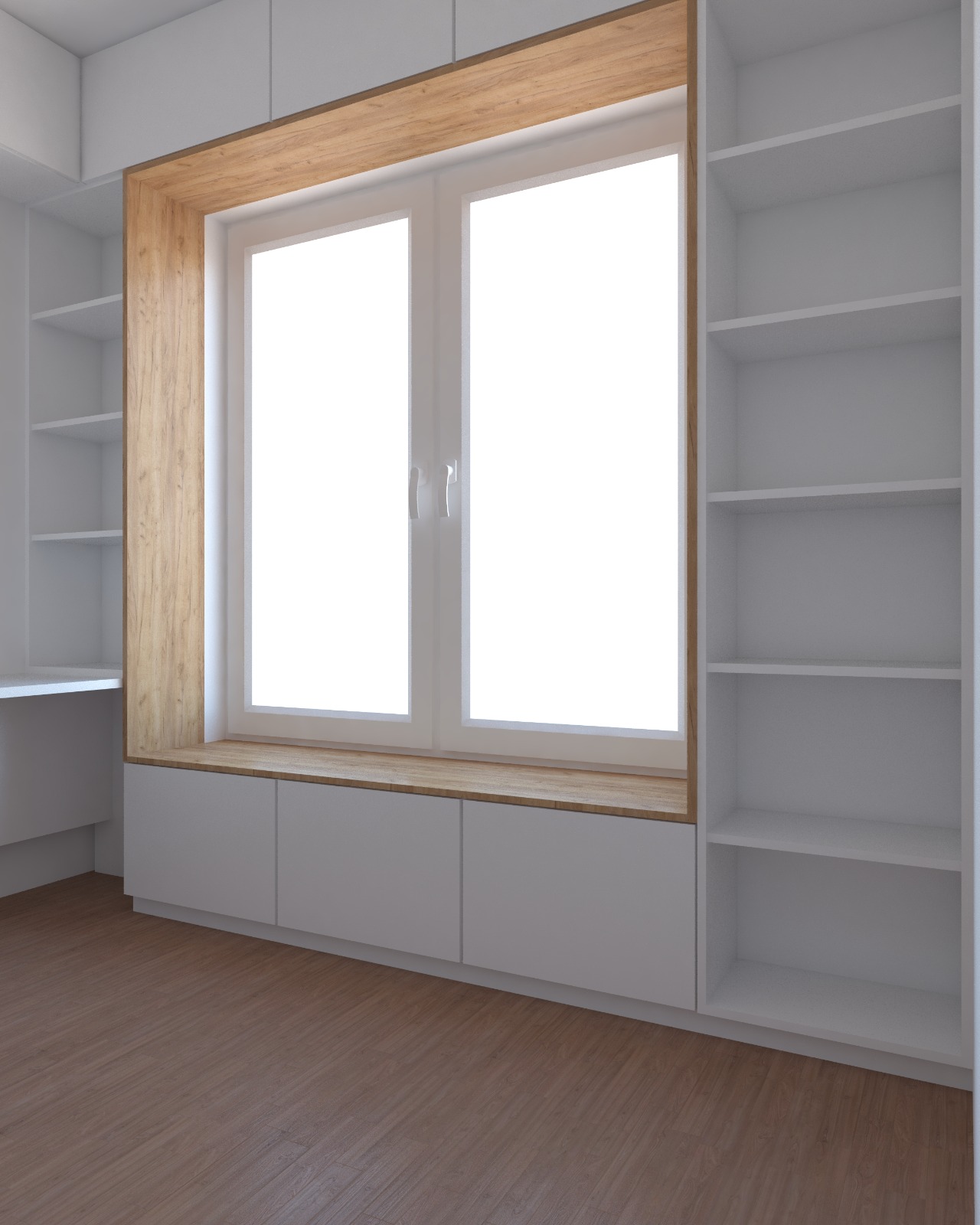 Wnętrze jest urządzone minimalistycznie, z zabudową stolarską projektowaną na wymiar, która maksymalnie wykorzystuje ścianę z oknem. Połączenie białych frontów z drewnianą wnęką tworzy czysty, uporządkowany i ciepły efekt, a regały oraz górne szafki zapewniają dużo miejsca do przechowywania bez obciążania przestrzeni. Długi blat po lewej stronie pełni funkcję wygodnego biurka, pozostawiając wnętrze lekkim i funkcjonalnym.